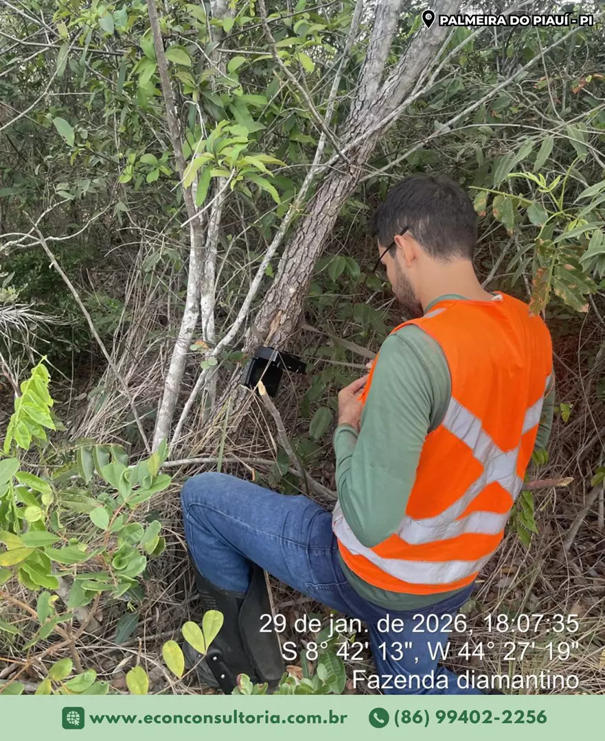 O primeiro trabalho foi realizado no município de Palmeira do Piauí, onde foram executadas as atividades de inventário florestal, com levantamento das espécies vegetais, medições dendrométricas e caracterização da vegetação local. Nesta etapa, também foi realizado o monitoramento da fauna silvestre por meio da instalação de câmeras trap, permitindo o registro fotográfico das espécies presentes na área.